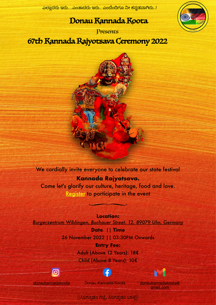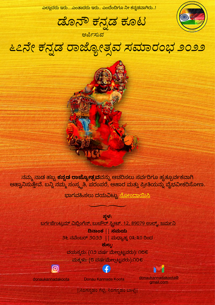 ಪ್ರೀತಿಯ ಕನ್ನಡಿಗರೇ, ನಾವು (ಡೊನೌ ಕನ್ನಡ ಕೂಟ) ನಮ್ಮ ಕನ್ನಡ ರಾಜ್ಯೋತ್ಸವವನ್ನು ಆಚರಿಸಲು ಎಲ್ಲರನ್ನು ಹೃತ್ಪೂರ್ವಕವಾಗಿ ಆಹ್ವಾನಿಸುತ್ತೇವೆ. ಬನ್ನಿ ನಮ್ಮ ಸಂಸ್ಕೃತಿ, ಪರಂಪರೆ, ಆಹಾರ ಮತ್ತು ಪ್ರೀತಿಯನ್ನು ವೈಭವೀಕರಿಸೋಣ.