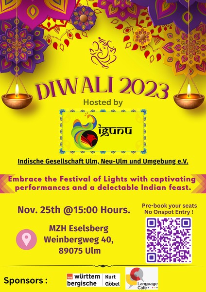 We are thrilled to have you join us for “Diwali 2023” We want to inform you that our event will be photographed and videographed in its entirety. By attending or performing at the event, you grant Indische Gesellschaft Ulm, Neu-Ulm und Umgebung e.V. (IGUNU) the rights to capture and use photographs and videos containing your likeness.