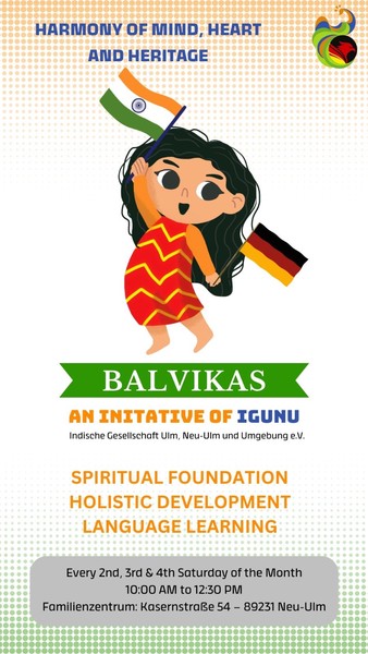 We are delighted to welcome you to Balvikas! Please be informed that the event will be photographed and recorded in its entirety. By attending or participating, you grant Indische Gesellschaft Ulm, Neu-Ulm und Umgebung e.V. (IGUNU) the rights to capture and utilize photographs and videos featuring your likeness or that of your child.