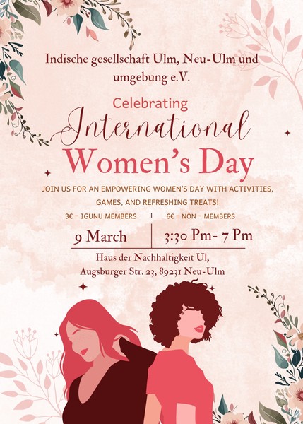 We are delighted to have you join us for the International Womenβs Day 2025 celebration. Please be informed that the event will be photographed and videographed in its entirety. By attending or participating, you grant Indische Gesellschaft Ulm, Neu-Ulm und Umgebung e.V. (IGUNU) the rights to capture and utilize photographs and videos featuring your likeness.