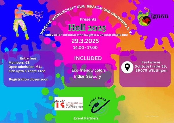 We are delighted to have you join us for the Ulm Holi 2025 celebration. Please be informed that the event will be photographed and videographed in its entirety. By attending or participating, you grant Indische Gesellschaft Ulm, Neu-Ulm und Umgebung e.V. (IGUNU) the rights to capture and utilize photographs and videos featuring your likeness.